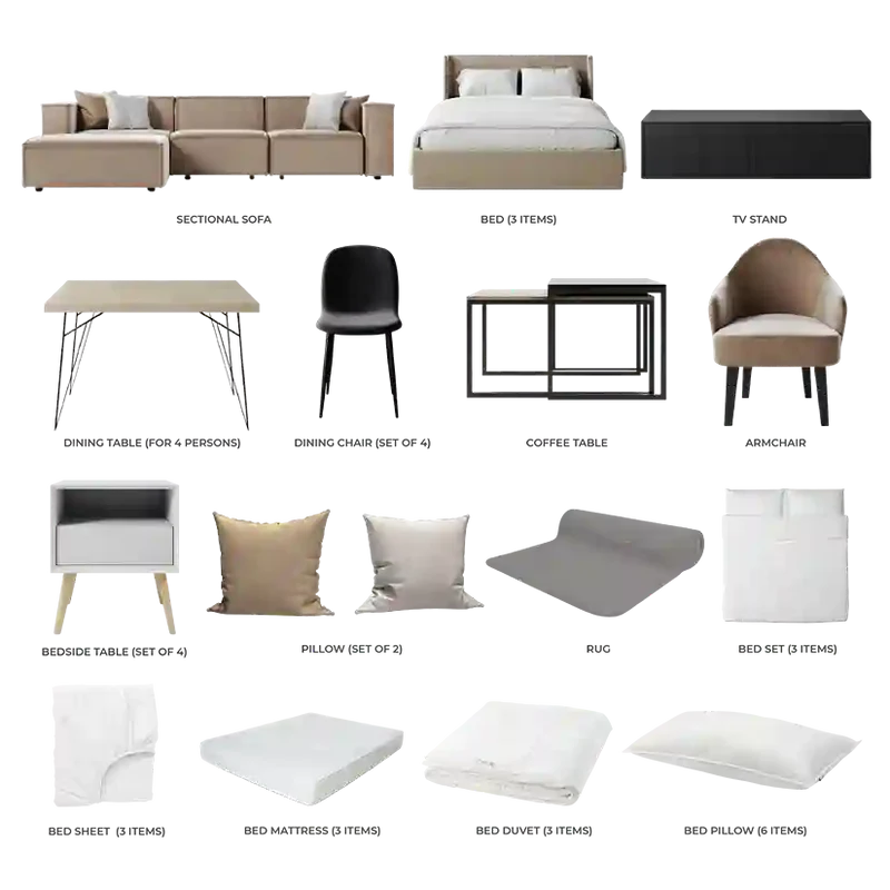 The Contemporary Luxe Collection combines sleek design and practicality, featuring furniture in calming tones and clean, minimal lines. This set includes a living room set, dining room set, and bedroom set, all crafted to create a sophisticated, neutral aesthetic.