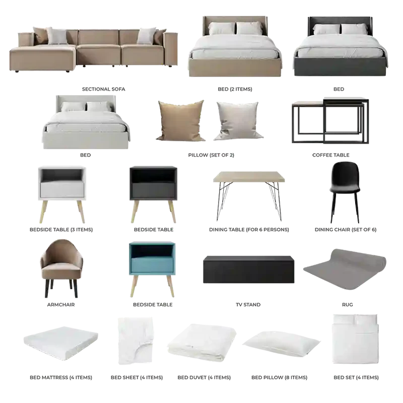 The Contemporary Luxe Collection combines sleek design and practicality, featuring furniture in calming tones and clean, minimal lines. This set includes a living room set, dining room set, and bedroom set, all crafted to create a sophisticated, neutral aesthetic.