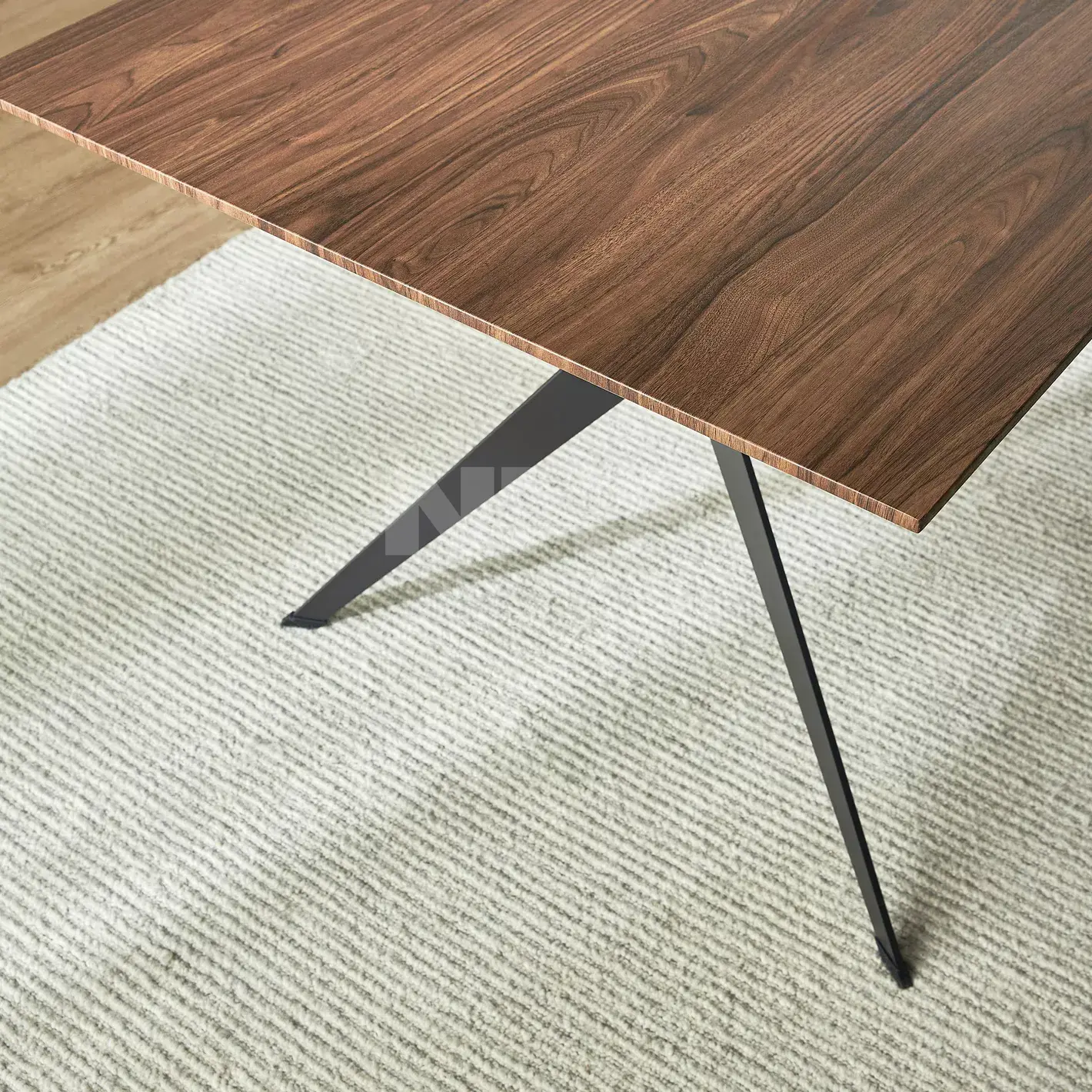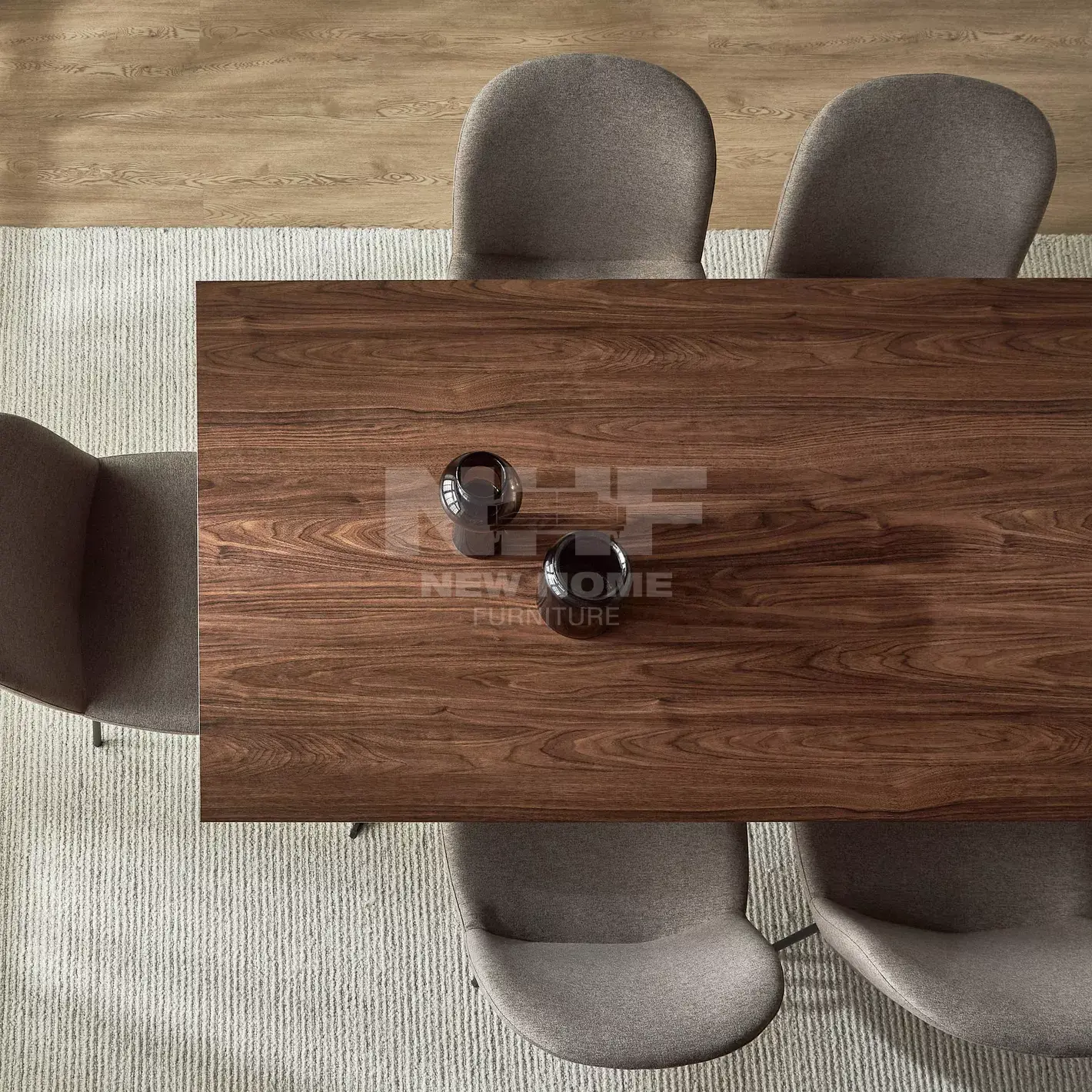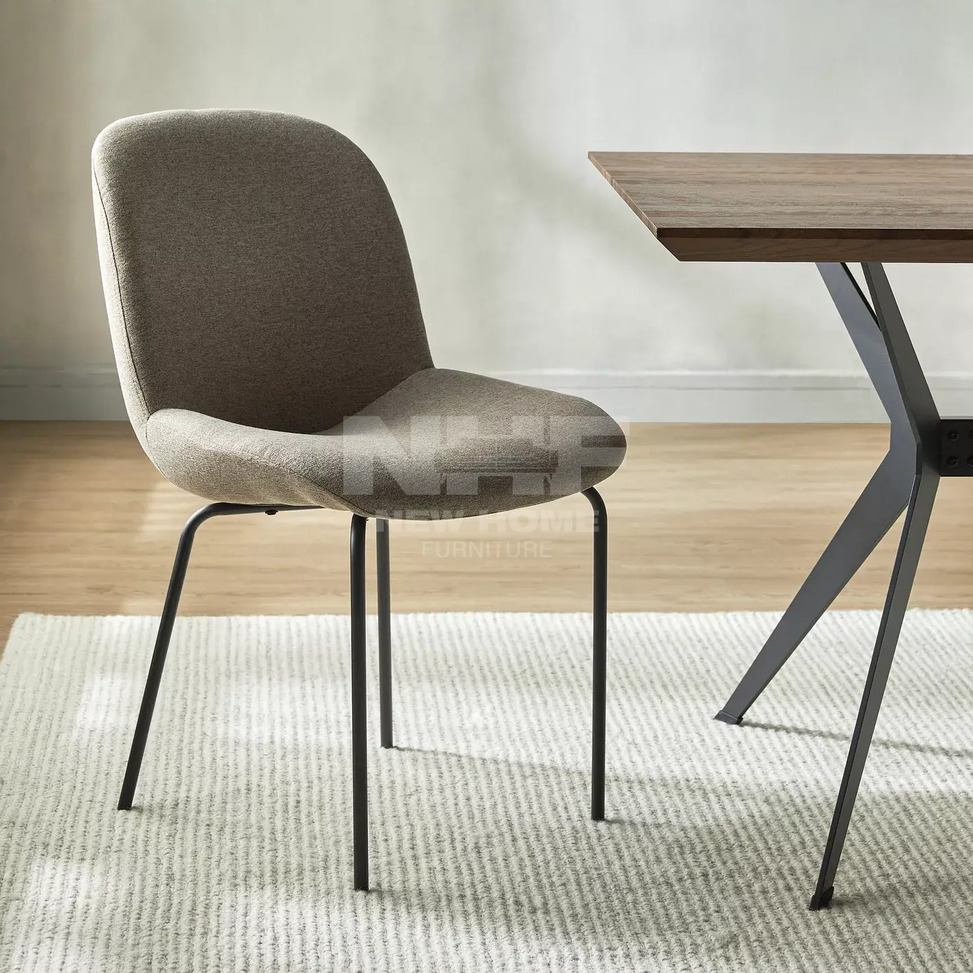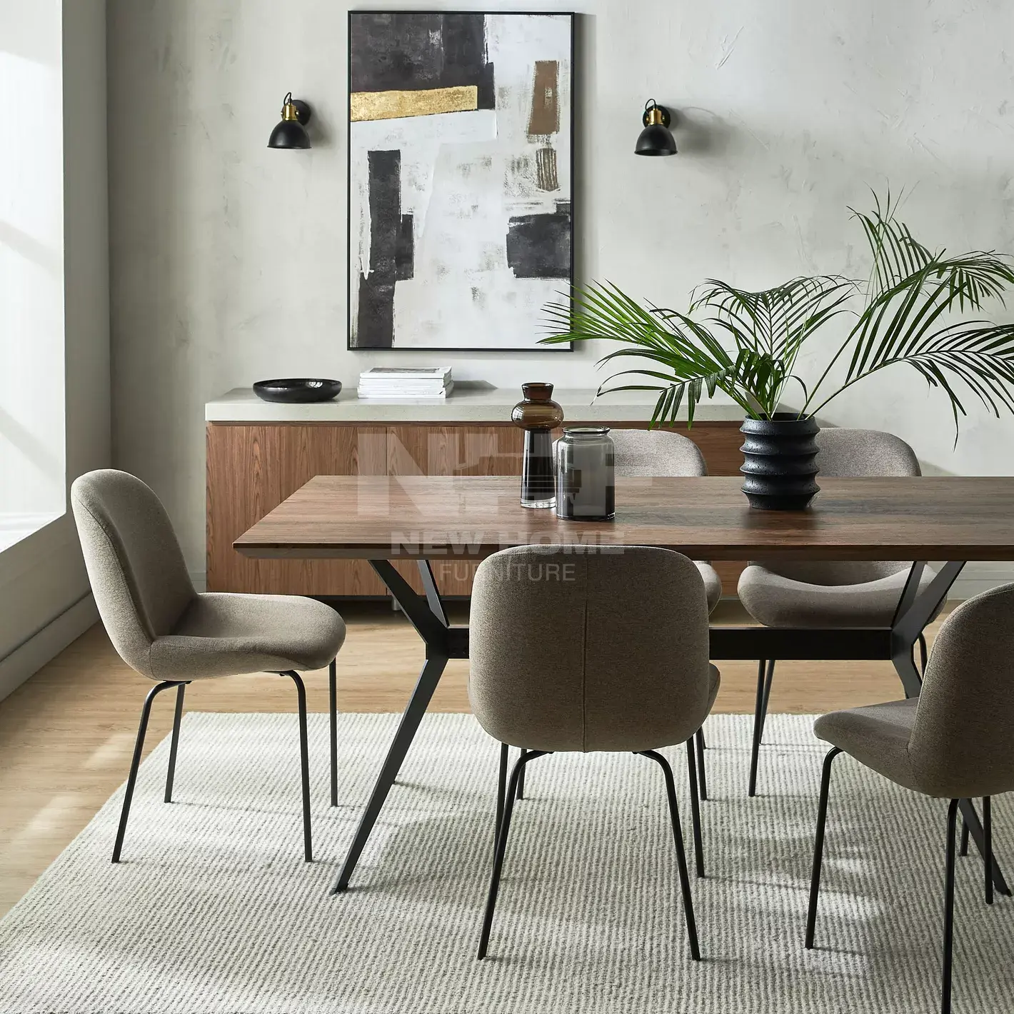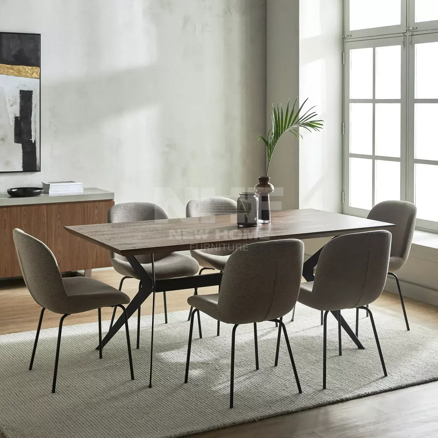 A contemporary rectangular dining set featuring an MDF tabletop with metal legs and six fabric-upholstered chairs, designed for stylish family meals and gatherings.