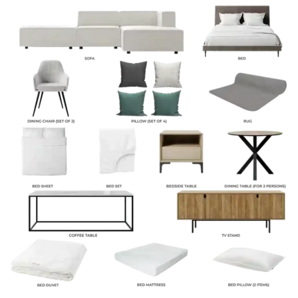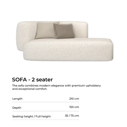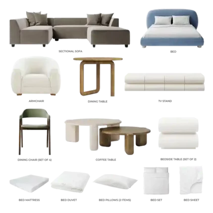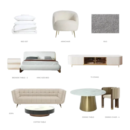 The living room embodies understated luxury, with minimalist silhouettes, neutral tones, and refined details. Soft boucle textures and marble-inspired finishes add depth and sophistication, creating a serene space ideal for both relaxation and entertaining.