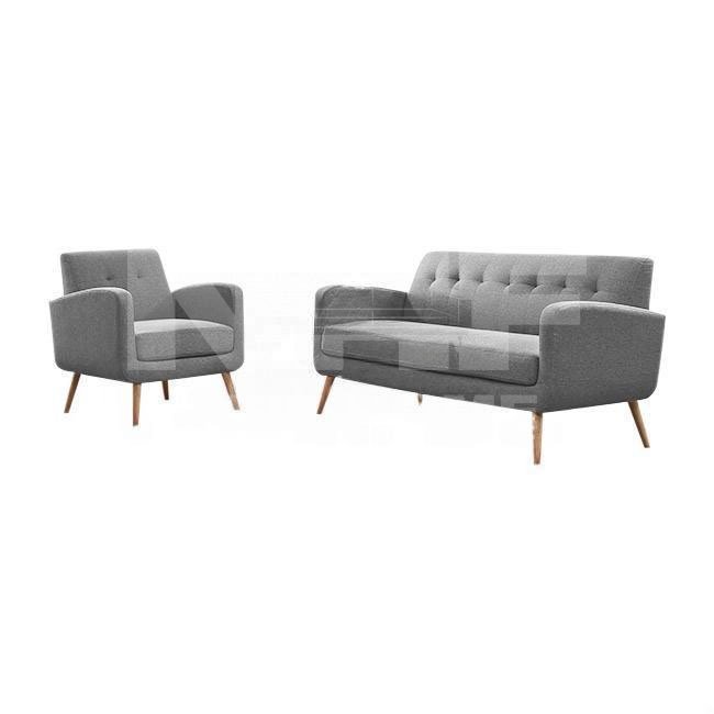 A mid-century inspired sofa and armchair set featuring textured linen-look fabric, lace tufting, and high-resilience foam cushions for designer comfort.